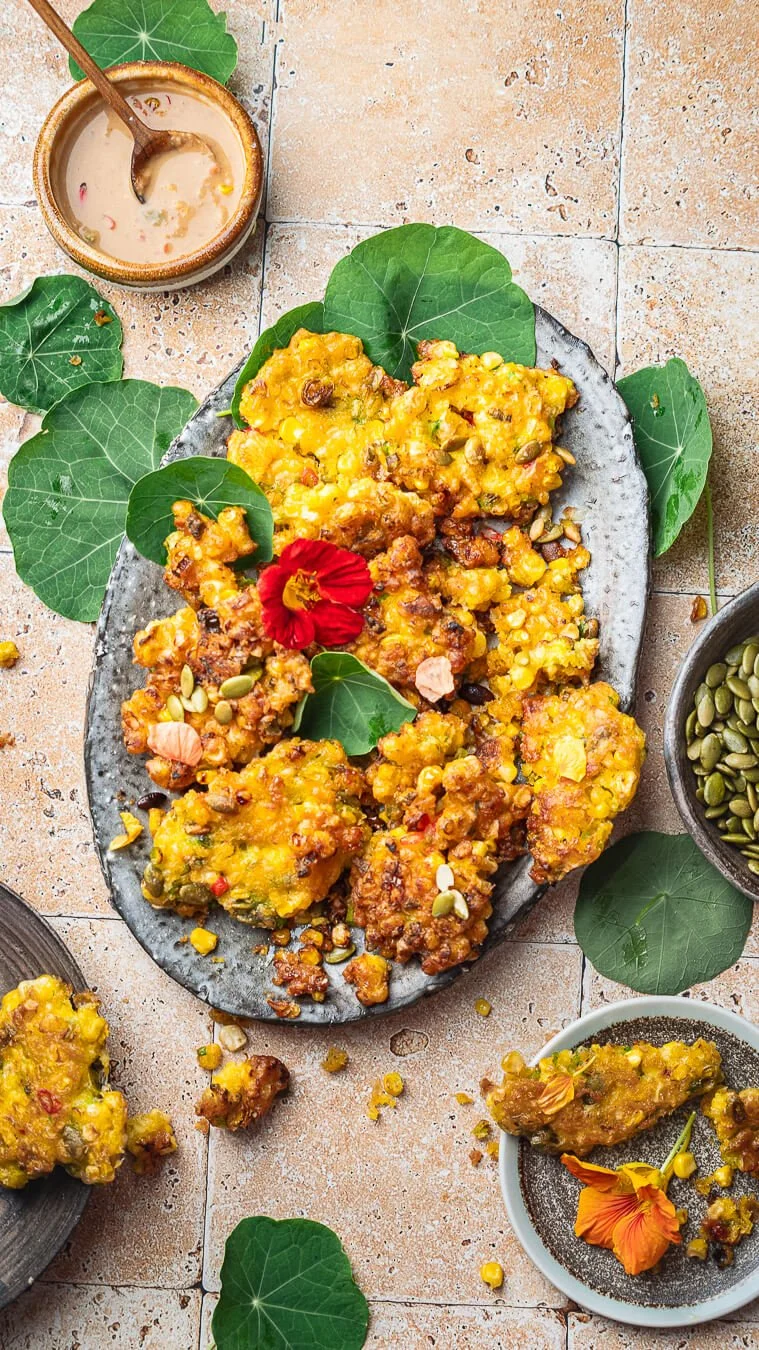 Corn fritters on a textured plate, garnished with green leaves and red flowers, surrounded by small bowls of sauce and seeds on a tiled surface shot in MOTK studio